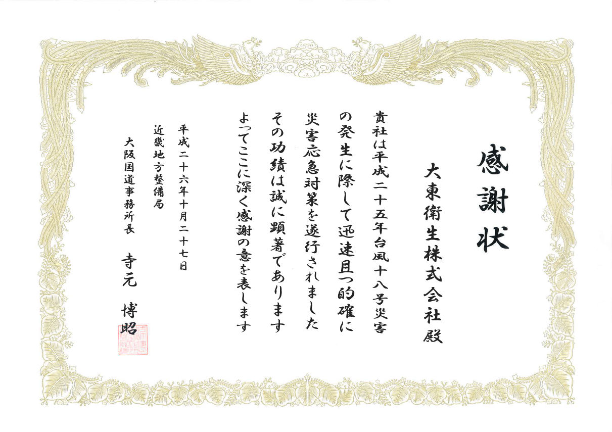 国土交通省より、昨年の台風災害についての応急対策について、表彰されました。